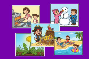 Krátké příběhové stripy na 6 okének. Po vytisknutí a rozstříhání je úkolem je správně seřadit a vyprávět příběh, který se na nich odehrává.