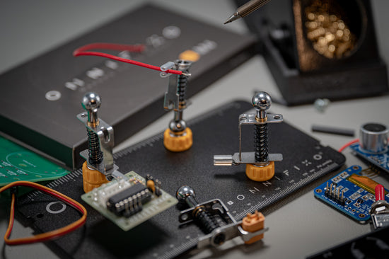 Ruční pájení vyžaduje poměrně hodně rukou a protože jejich počet má většina z nás omezený, tak se hodí nejrůznější pomůcky, které další končetiny přidávají. Nejsem velký příznivce klasické levné „třetí ruky s lupou“ za stokorunu – typicky není dostatečně pevná a krokodýlky mohou poškodit izolaci. Absolutně jsem si oblíbil Omnifixo – opravdu praktické magnetické držáčky. Jsou docela drahé, ale mohu je opravdu doporučit.
